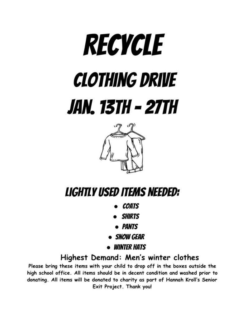 Hannah Kroll is hosting a clothing drive from January 13th through the 27th. Please bring in any unwanted clothing articles to the boxes outside the high school office